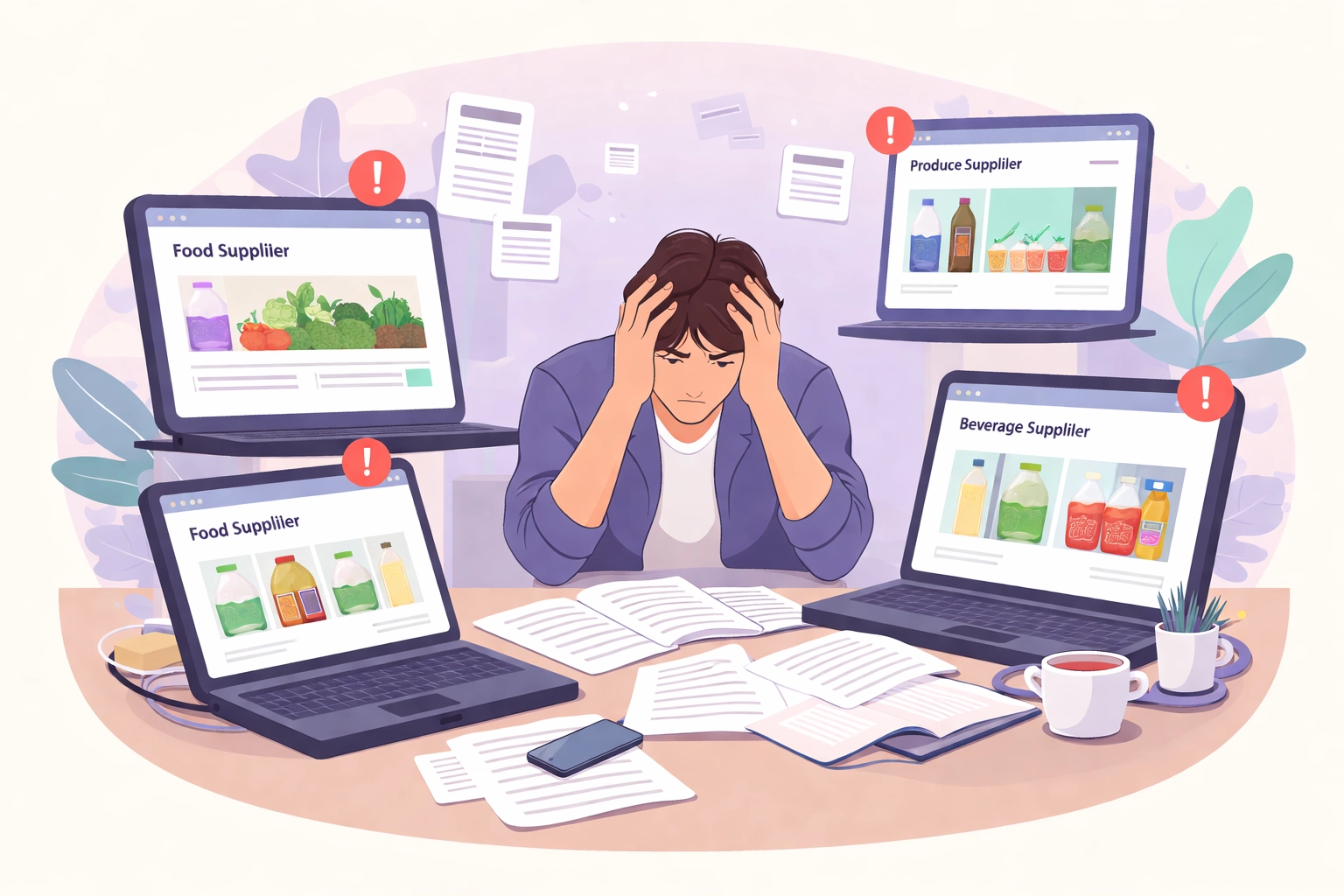 You're switching between three browser tabs. One for your produce supplier. One for your meat distributor. Another for dry goods. Each has its own login. Its own ordering system. Its own invoice format.